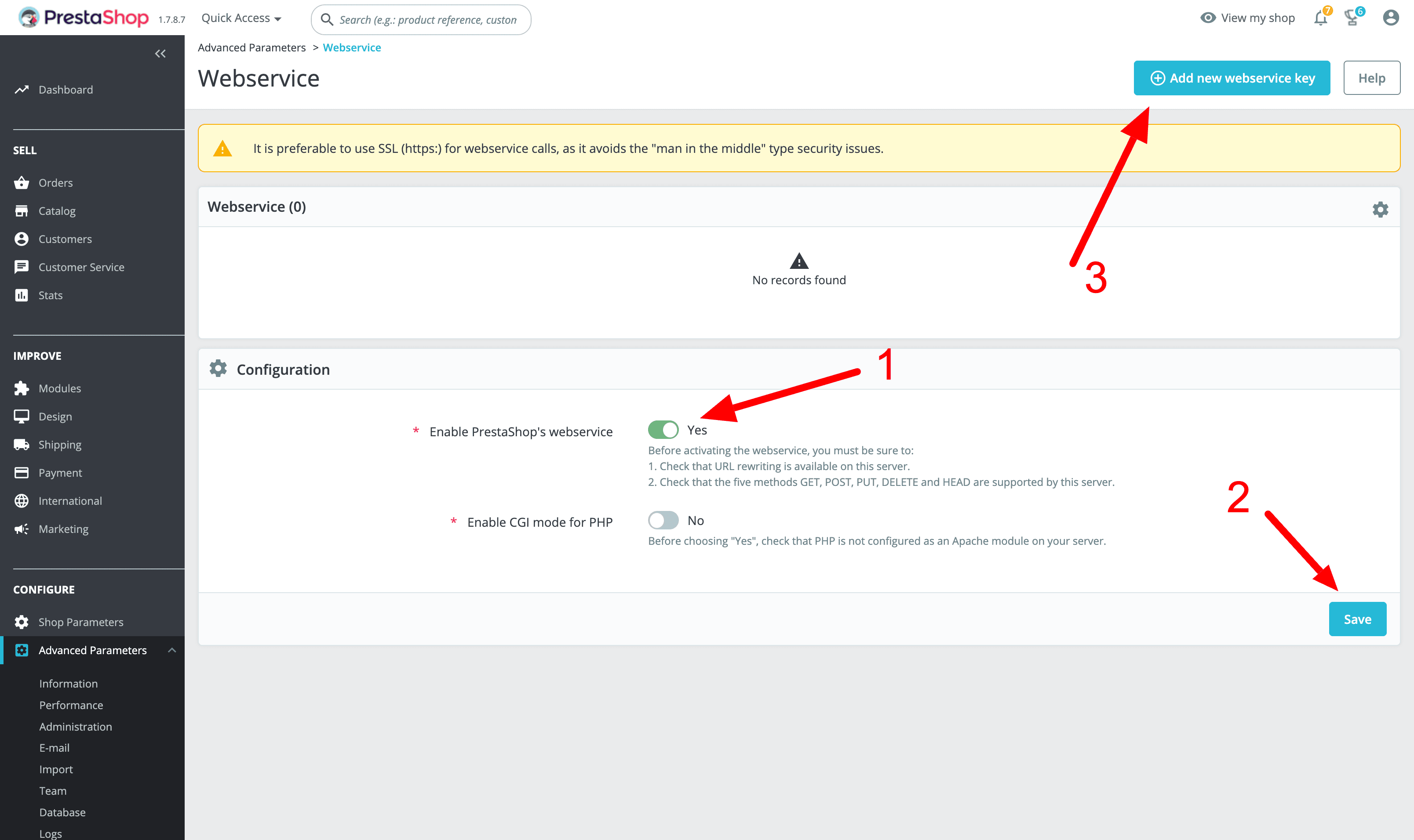 The first step is to login to the backoffice of your PrestaShop website. Here you should go under Advanced Parameters and then click Webservice.