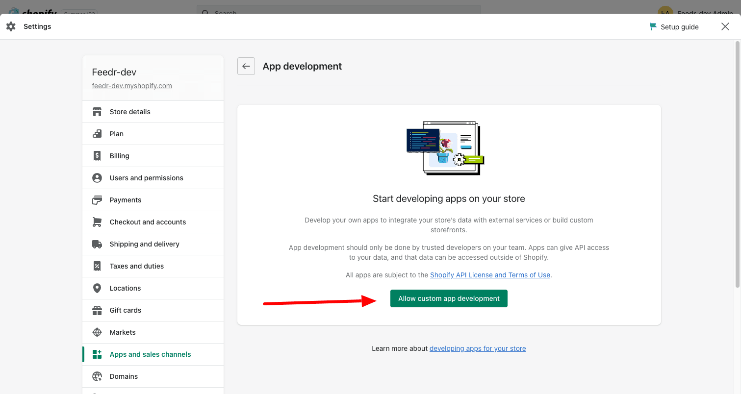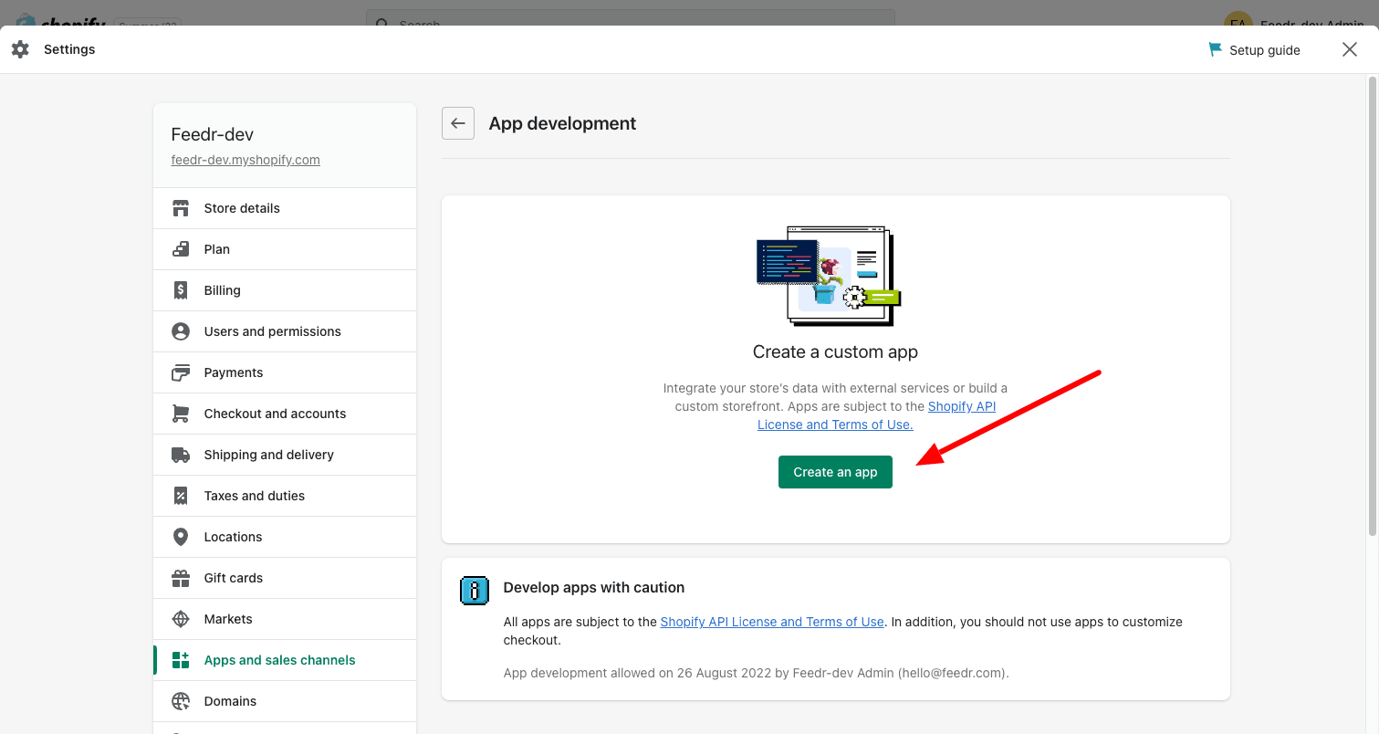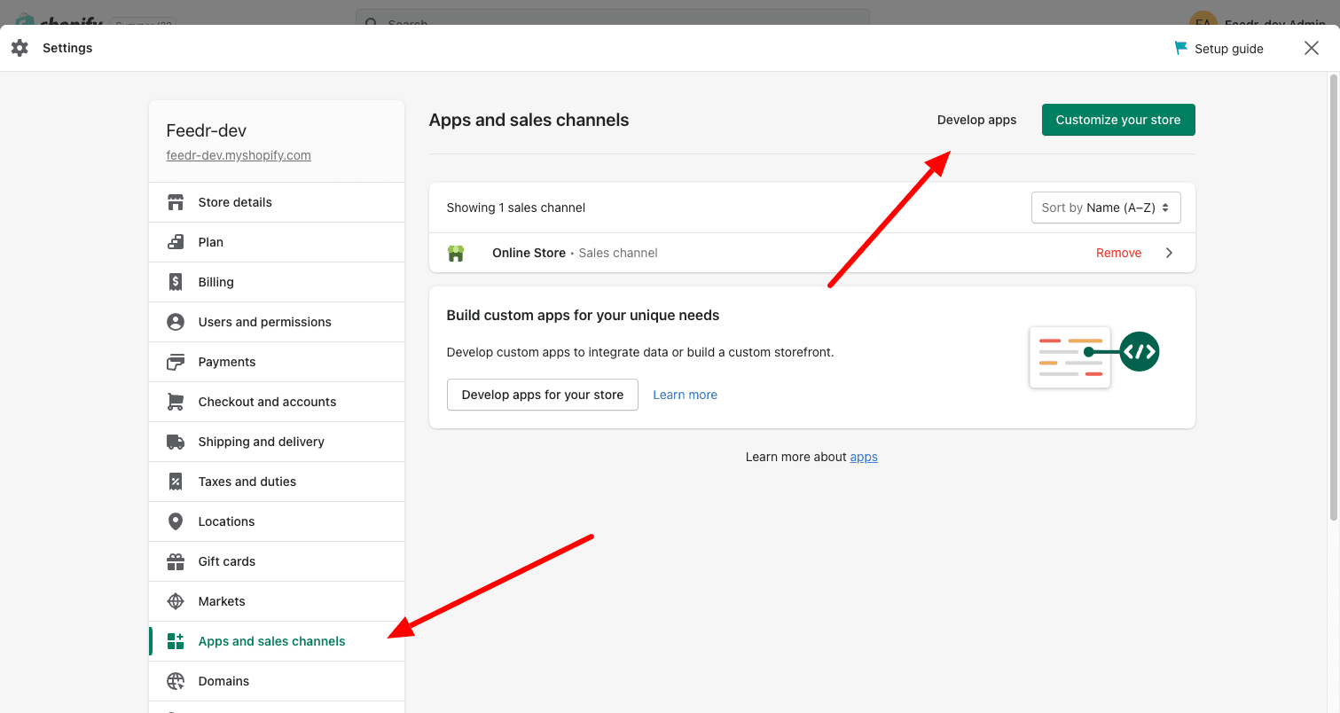 2. Click "Apps and sales channels" in the left sidebar and then on "Develop apps"