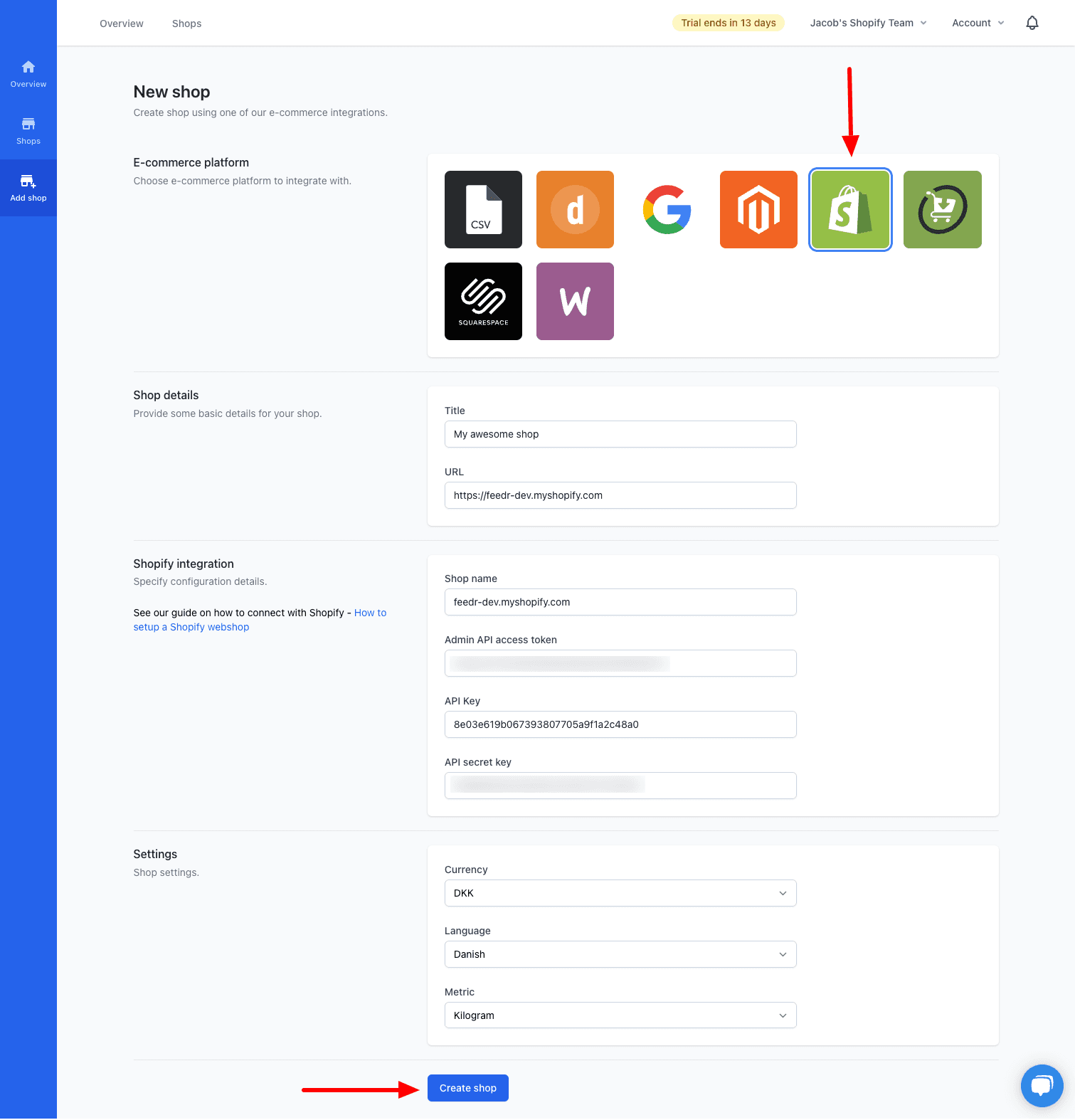 2. Select the Shopify integration and fill out the form for creating a shop.