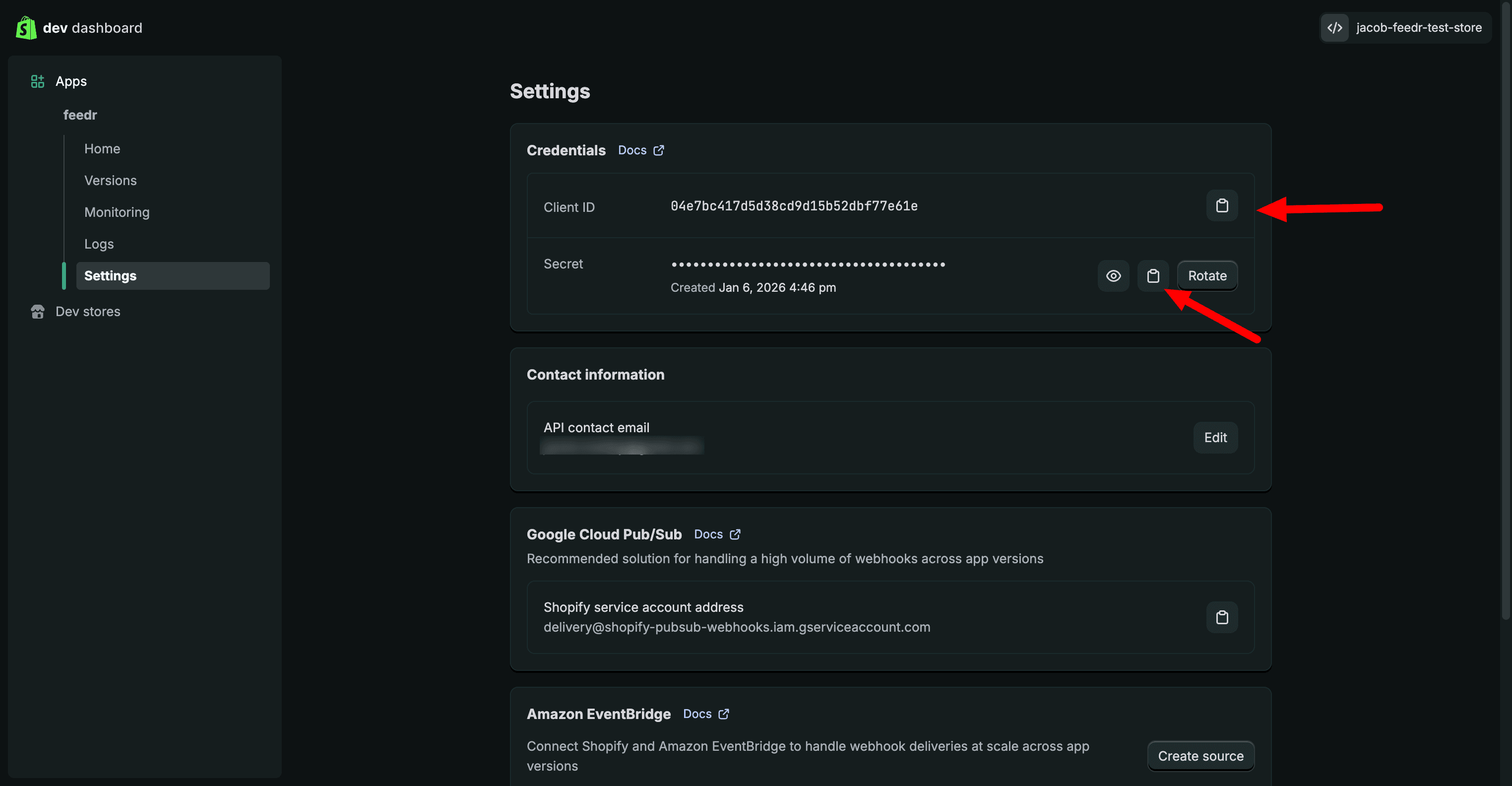 Here you need to copy the Client ID and Secret. You'll need them later when creating your shop in Feedr.