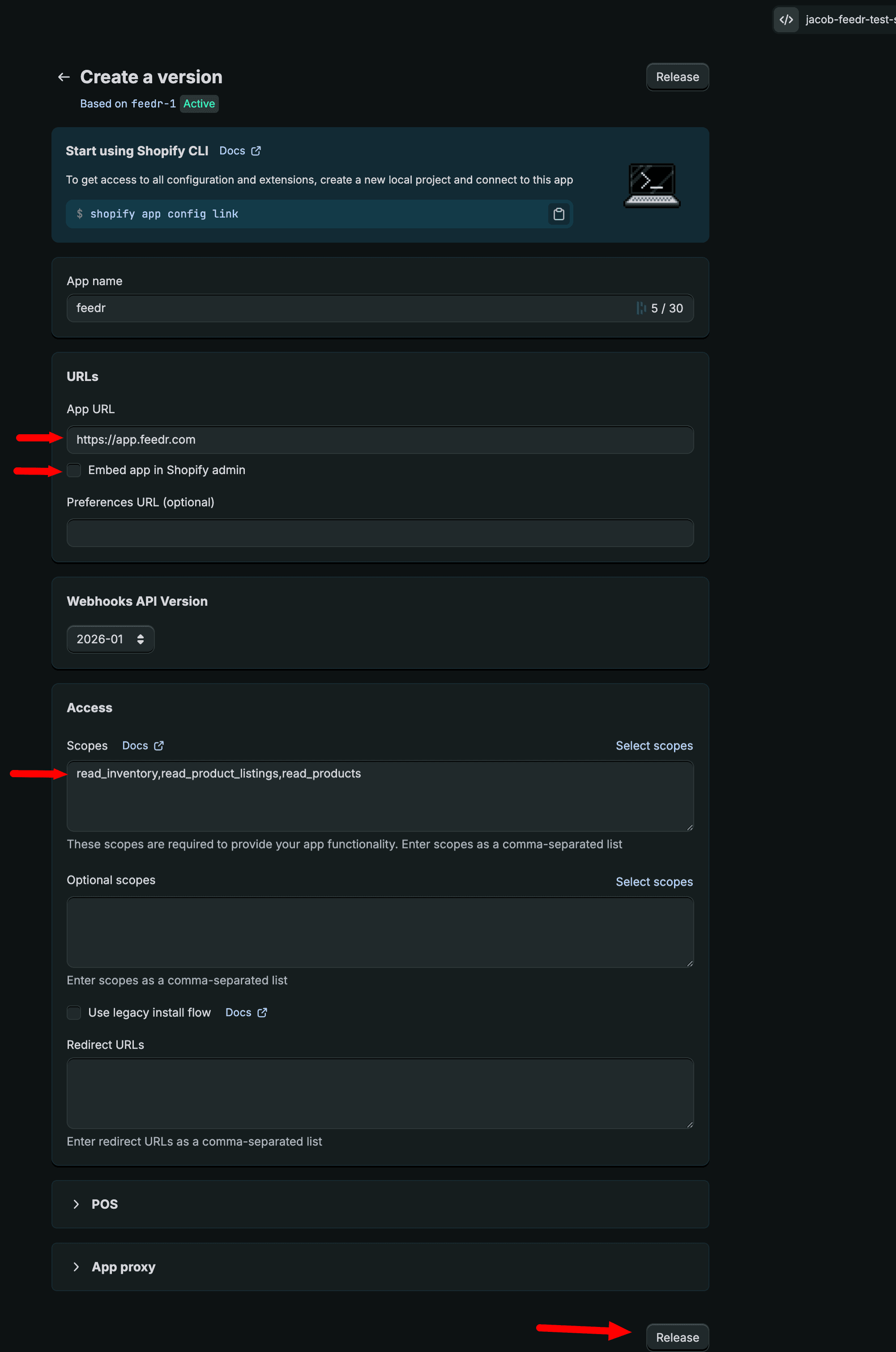- Embed app in Shopify admin: Uncheck