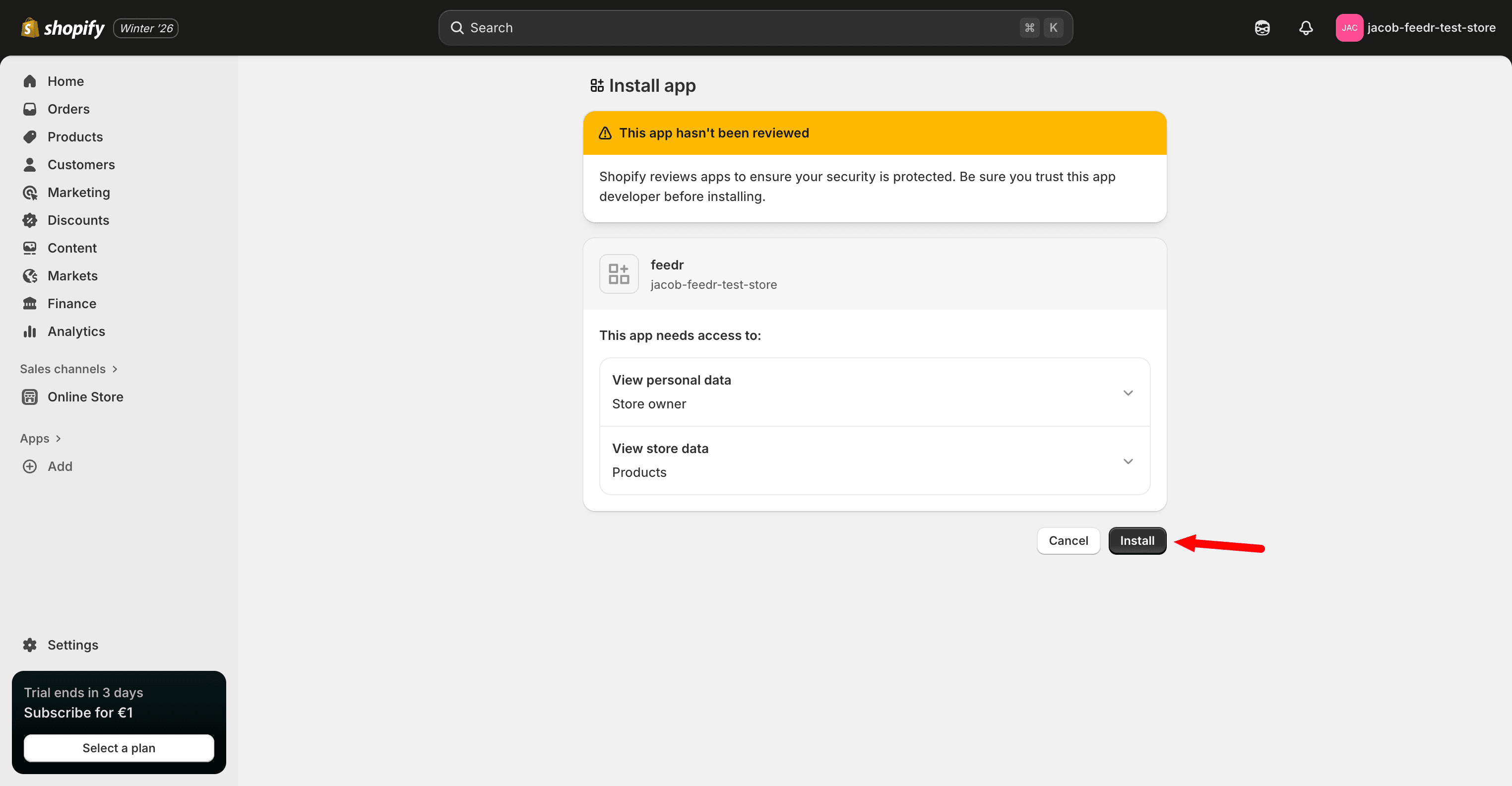 This will redirect you to the Shopify admin again. Now you need to confirm the installation by clicking the "Install"-button.