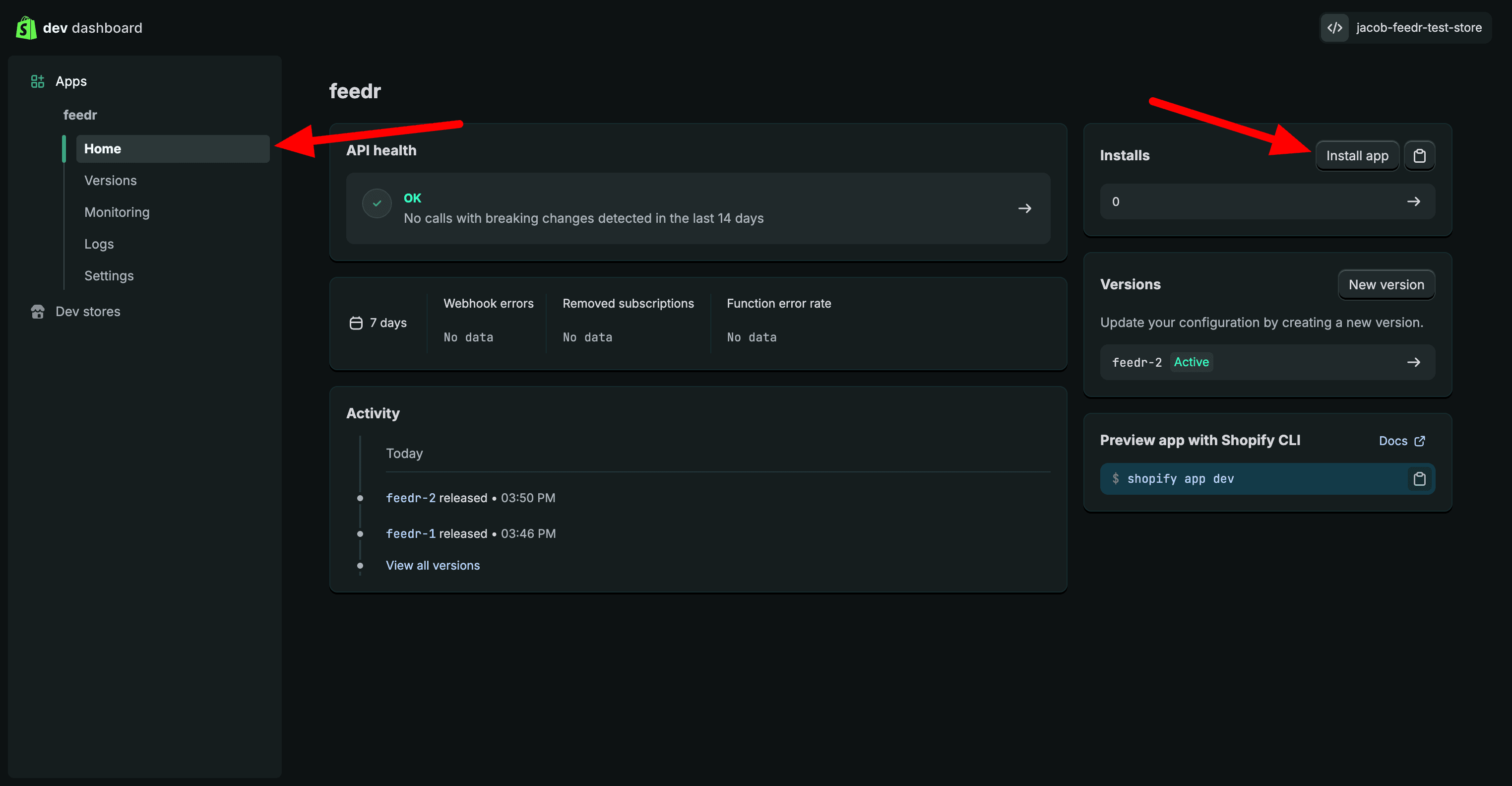 Now you need to install your app in your shop. Go to the "Home"-page and click on the "Install app"-button.