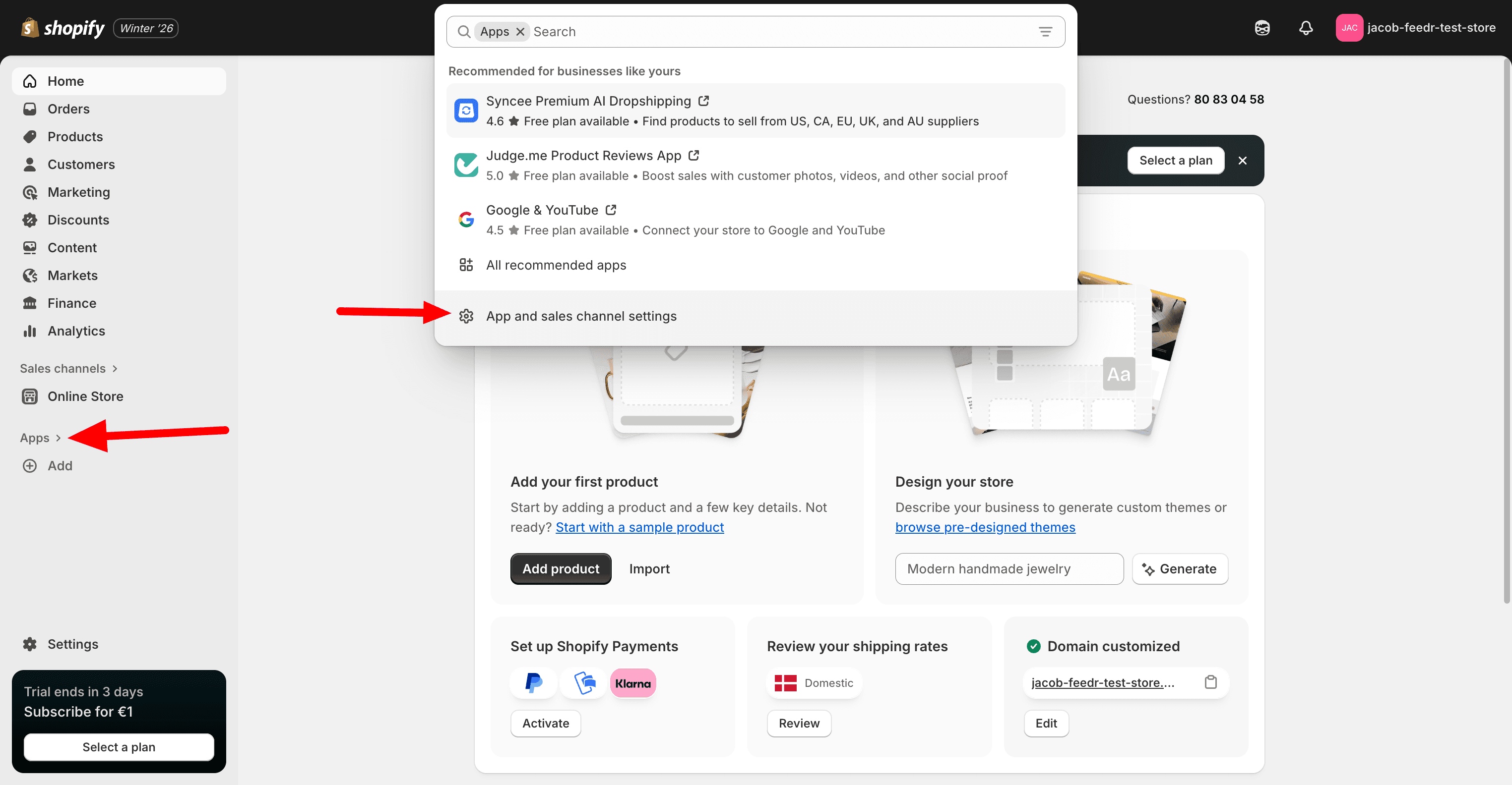 In your Shopify admin, click on the "Apps"-button in the left sidebar and then on "Apps and sales channels".